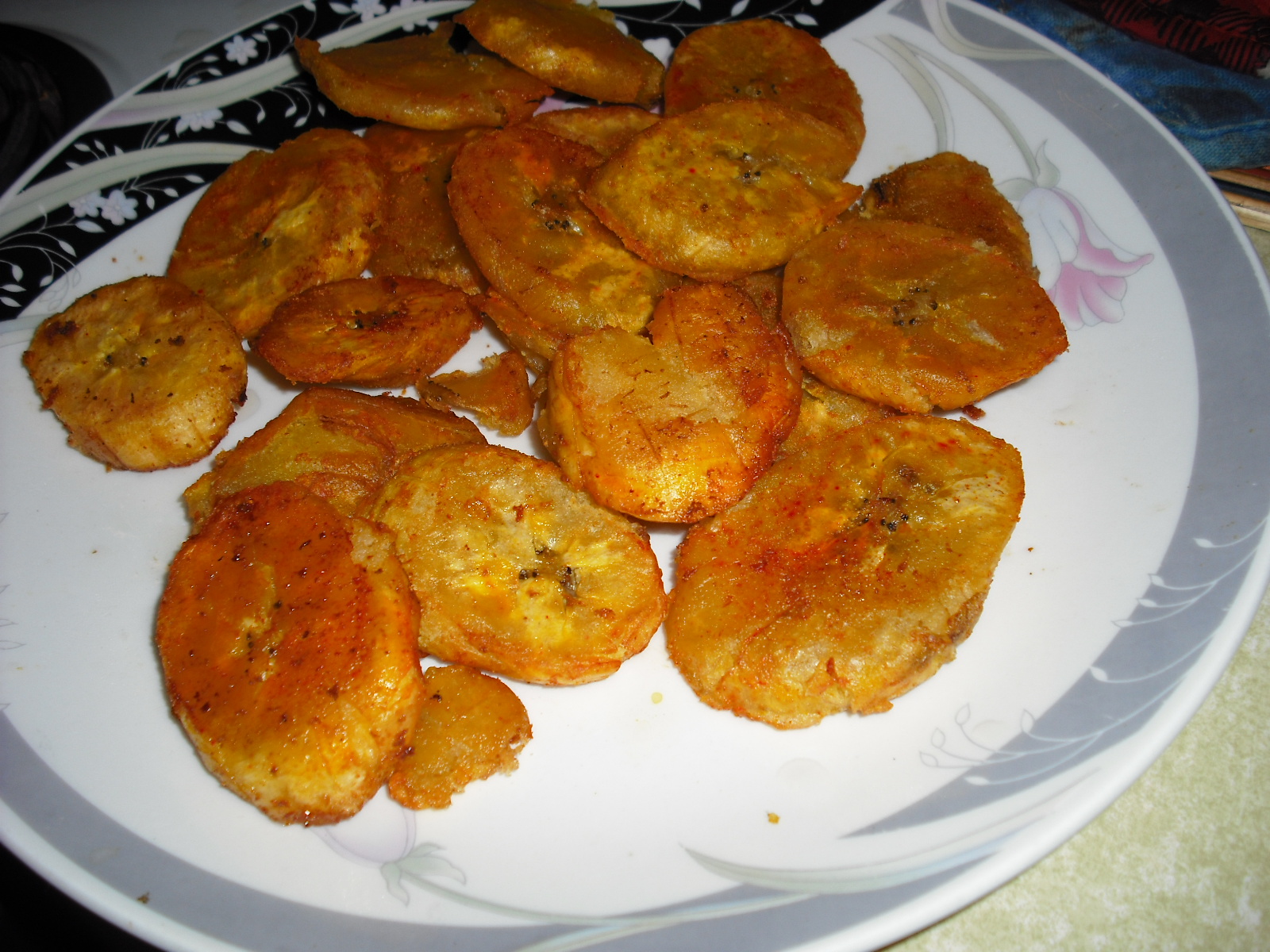 Home made fried plaintains are great sides with pork chops or beefsteak (in spanish emapnada), when you fry cube beefsteak in flour batter. There are two types of plaintains, there are the sweet yellow ripe bananas that have a sweet flavor to them when you fry it and are great for breakfast. Green plaintains are not sweet but are delicious when flavored with garlic and if fried thinly resemble plaintain chips. These plaintains are cut on a diagonal and not too thick. If you have a deep fryer or a deep large skillet add oil to cover the entire plaintains add garlic powder and pinch of salt to plaintains. As soon as the plaintains brown slightly take them out and press them with the plaintain peel or skin to flatten slightly then place in oil again. Leave in until plaintains are crispy, eat them when they are warm. Great with a garlic butter sauce and porkchops and lettuce tomato salad. These are great sides with rice as well. Sweet plaintains are great and cooked the same way, only that these plaintains are better with scrambled eggs and breakfast items such as corn beef hash. At least I like to eat these with these items.