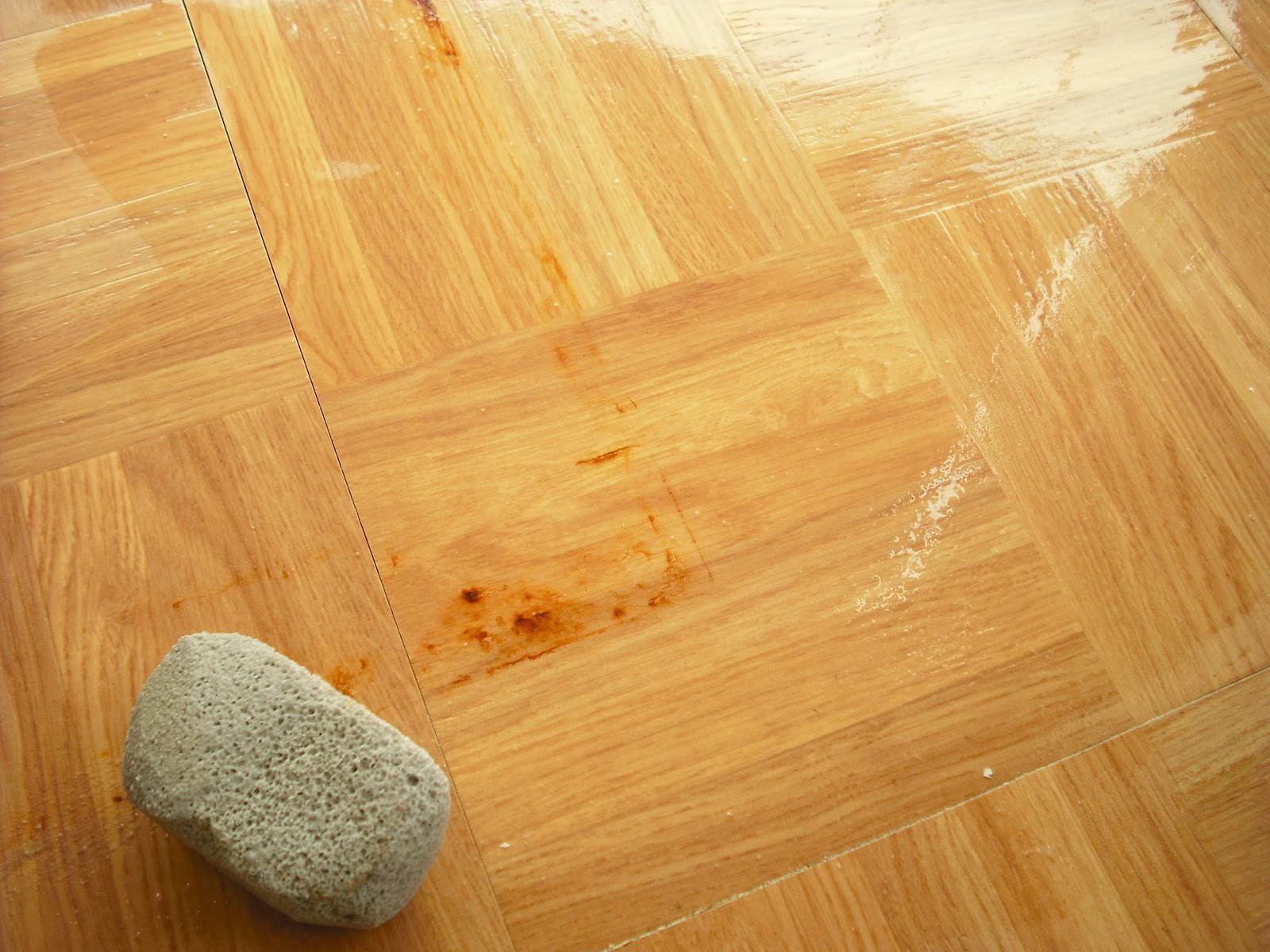 I learned of the use of pumice stone as a ceramic cleaner online. It worked to remove calcium and lime stains around toilet and bath tub. This worked so well, that it restored these items beautifully. I wondered if this would work on other surfaces, and to my amazement, it did. I tried using pumice stone on some vinyl tile flooring that had some rust stains from a file cabinent . I wet the floor with water and the pumice stone and gently rubbed the stone on the rust stain area. Just gently rub the stone not to scratch the tile; the stone disengrates slightly and leaves grainy residue. As the stain is removed take wet cloth and cleanup the dissolved residue. The floor looks rejuvenated and restored. Next, I plan to use it on porcelain tile as well. Pumice stone is a great inexpensive rust, calcium and lime cleaner.
