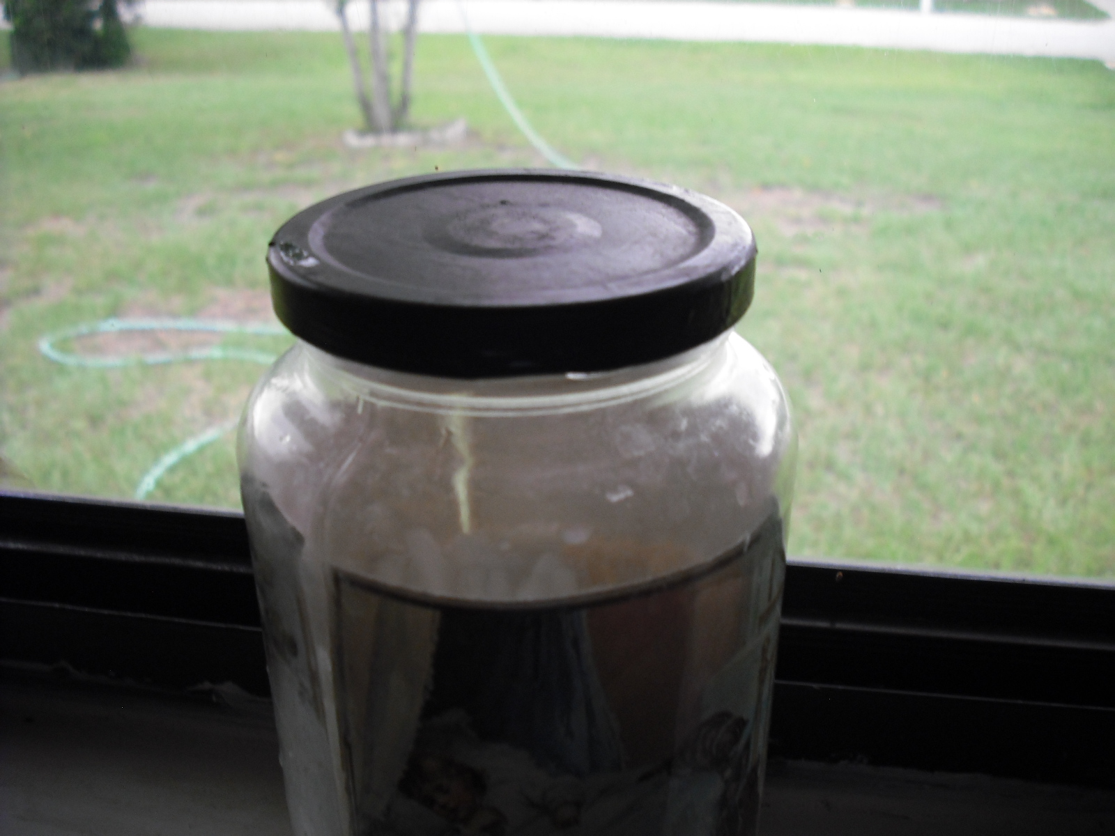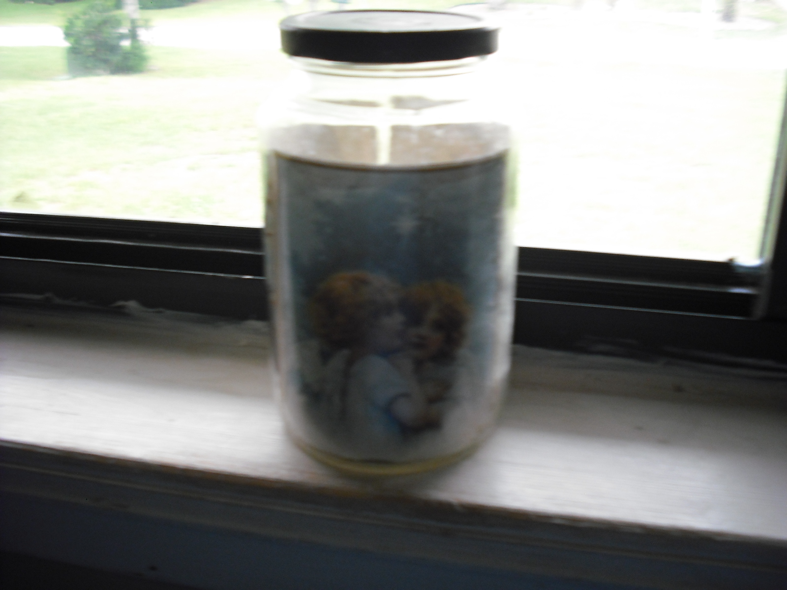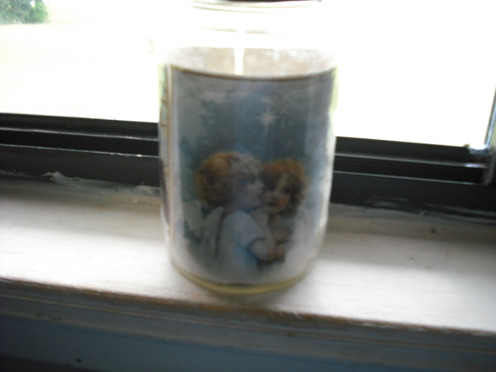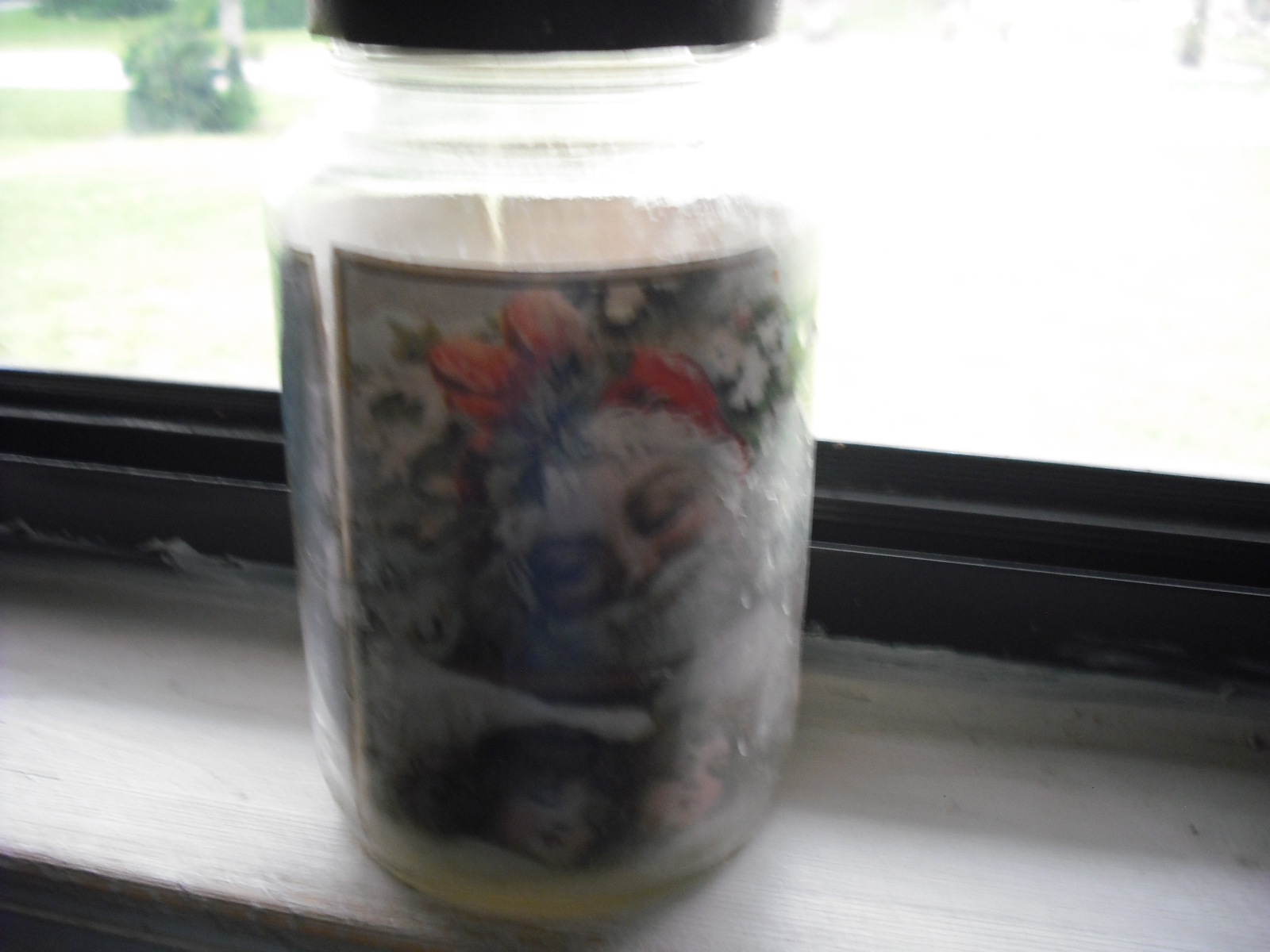 I had decoupaged this glass jar over 15 years ago and I have kept it because I made it as a q-tip holder. I took an ordinary spaghetti glass jar washed it out and soaked it in dish washing liquid for three days to get food odor out of it. I had this art catalog that sold reproductions of famous paintings, it was a beautiful catalog so I cut out the images and used them for various projects such as decoupaging card board keepsake boxes and journals. I took three images that were similar in size and dried the jar thoroughly then glued the images from the inside. I painted the lid a metallic copper brown color.