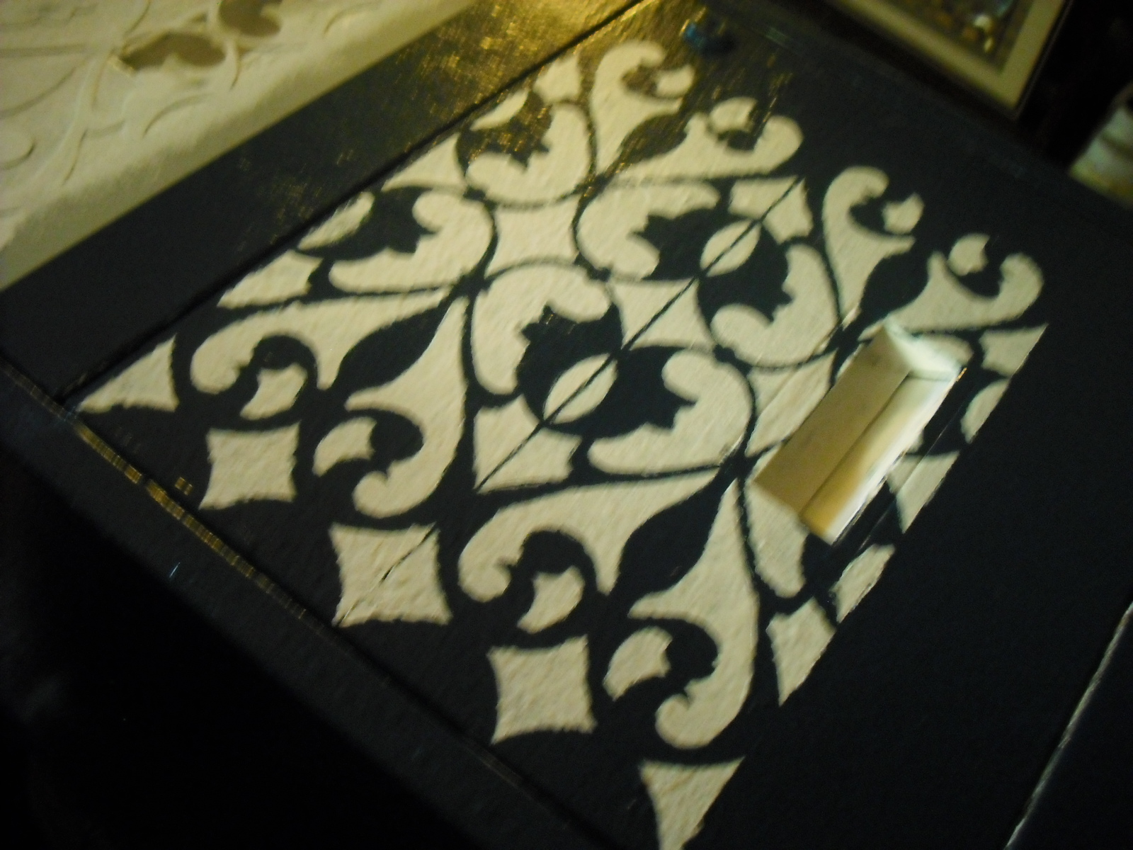 | Bought furniture stencil at royal design stencils for 29.00. Great for walls and furniture |