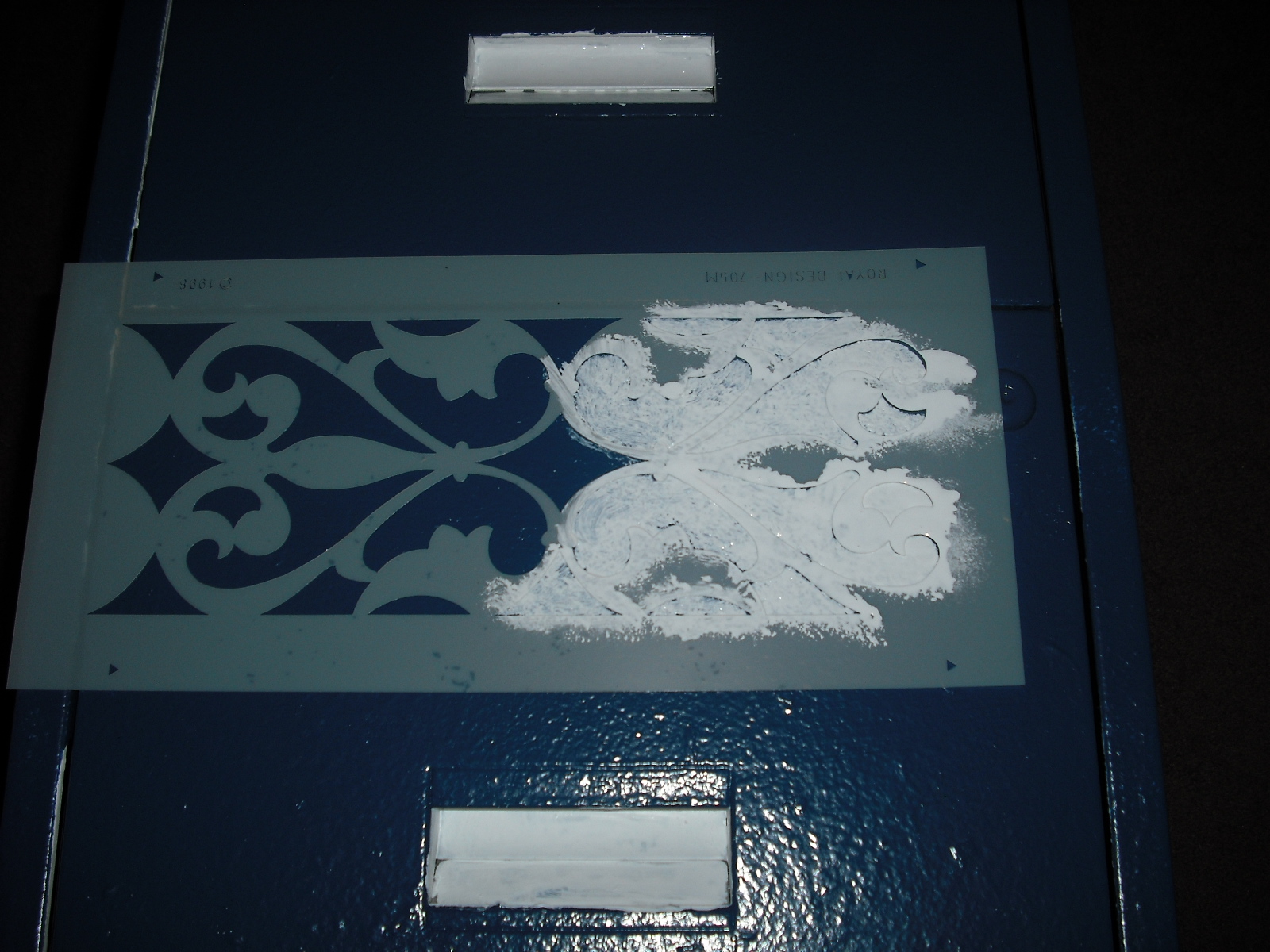 | Before stencilling, layout stencil to know what design you want on the front, then start one part, of cabinet, then start at the other part until stencil drys |