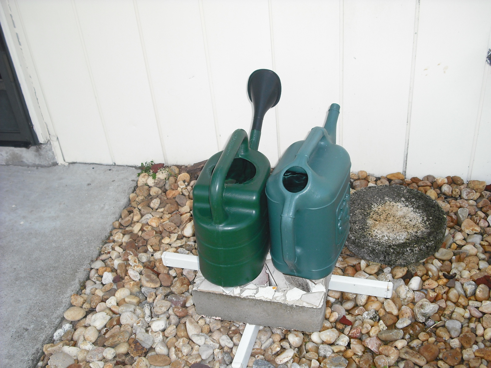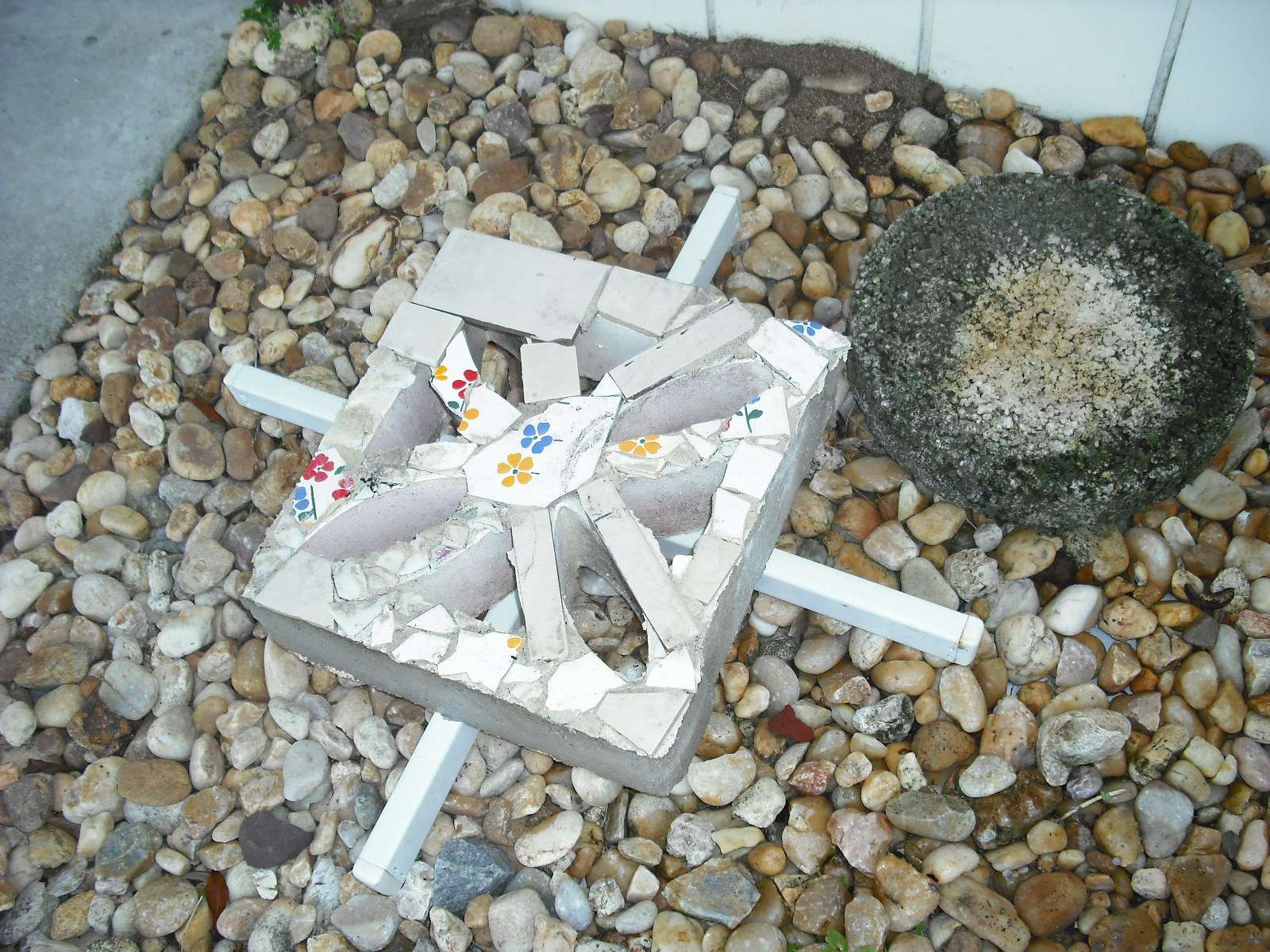 Use the parts of an old fan that no longer works and reuse to either repair or up cycle and create a new item. I reused the base stand part of the fan to use as a stand for a concrete stepping stone to place a plant or watering pots on it.