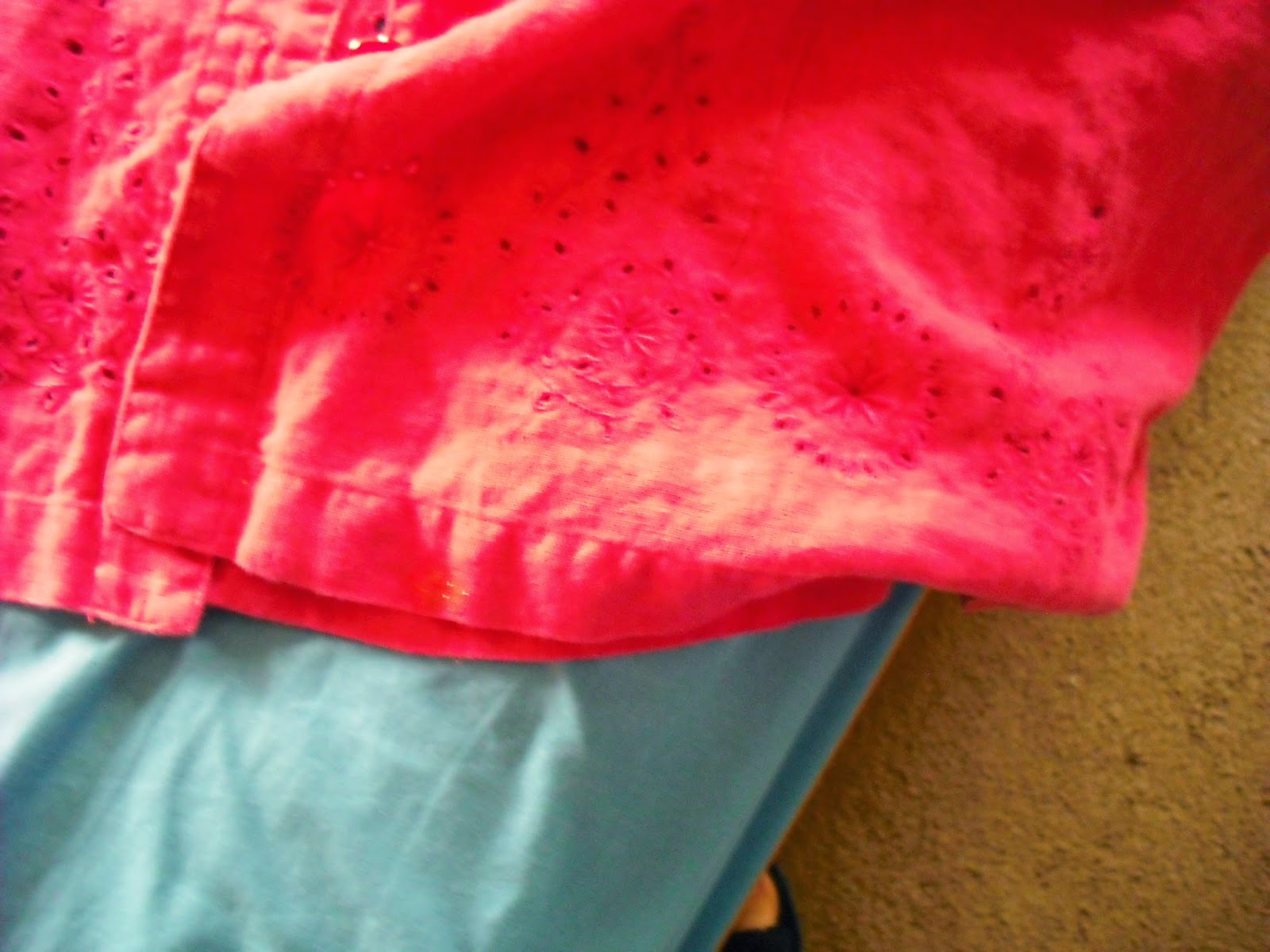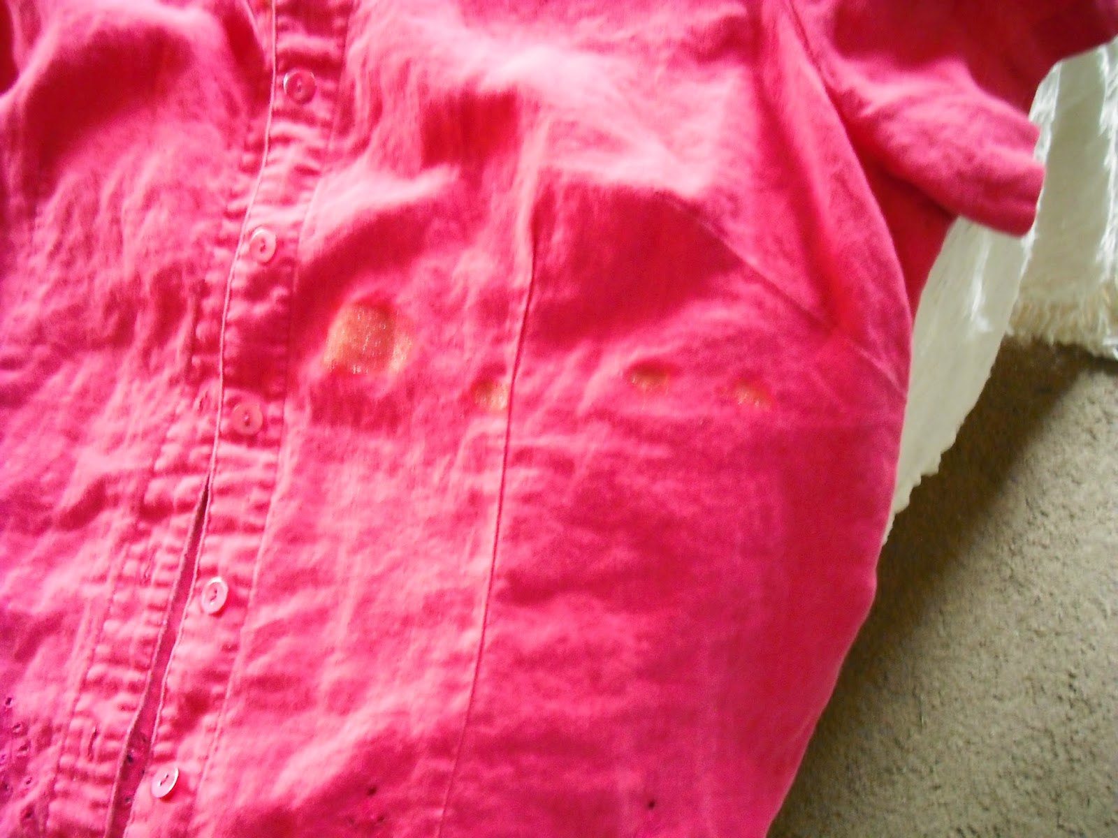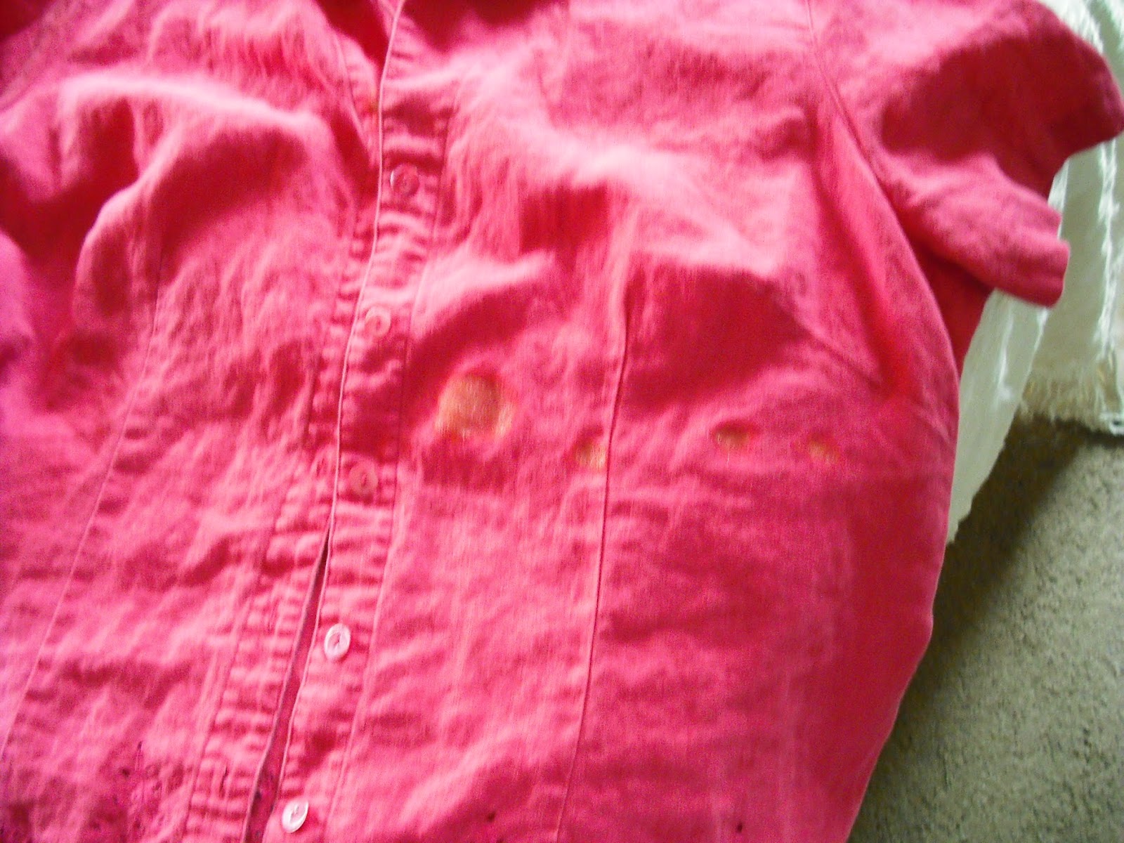 I was upset to discover that this really nice pink linen blouse I washed got messed up with two bleach stains from left over bleach residue from the washing machine. I had washed whites in the load before and some of the bleach residue remained in the washing machine when I washed some colored clothing afterwards. A pair of old black pants got messed up but the pink blouse was upsetting because it was really nice so I set out to try and save it. There were two bleach stains so I figured that I should get some fabric dye that matches exactly which is really hard because the blouse was a dusty rose color; so I searched online and purchased a small fabric dye in the same color and followed the directions on the bottle on the application of the dye. I picked a fabric dye that allows for multiple washings of the garment, the bleach stains were covered and I saved the blouse for future days and kept it out of a landfill.