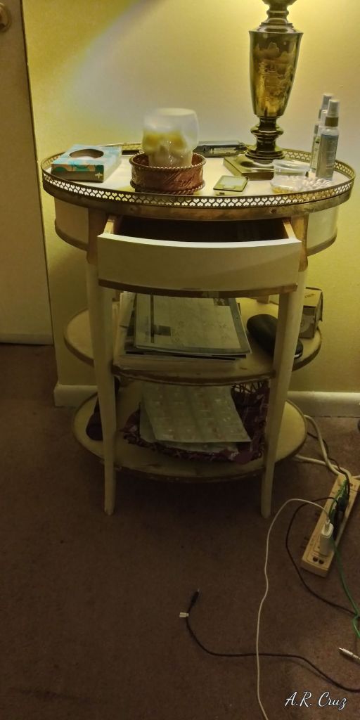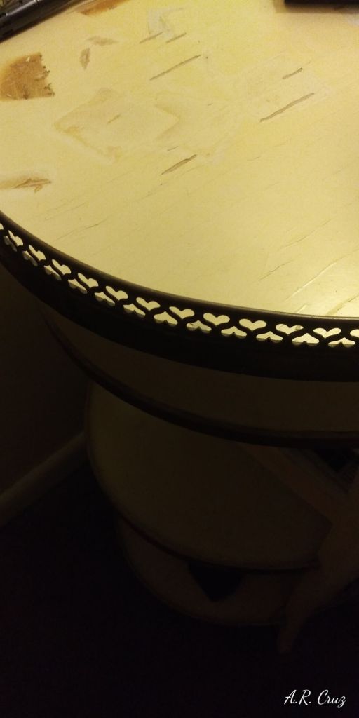 Twenty years later, still on my little toleware French table. The table needs TLC, but I love its distressed look and kept it because did not want to get rid of the original color and design. Here’s a look at both of my items that I love and cherish.