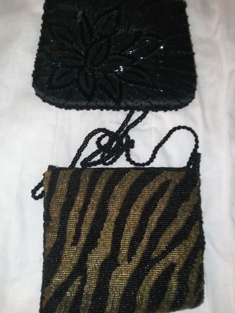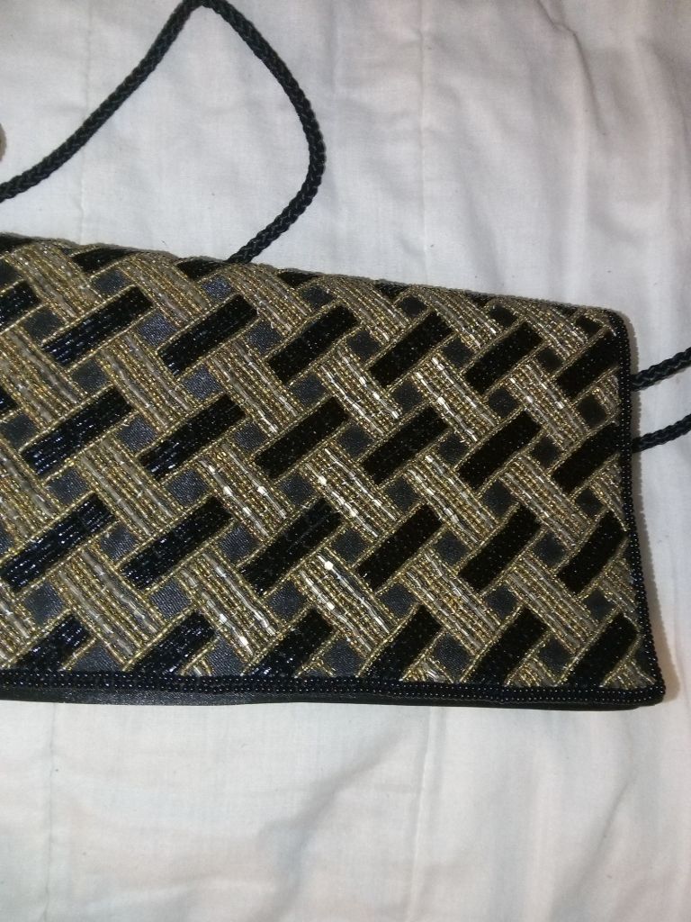The 1980s beaded handbags I have are the seed beads with gold metallic on a black sequined background.
